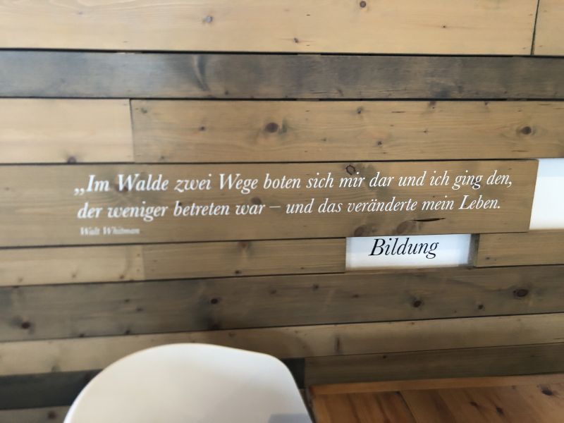 Ein Besuch im – sehr sehenswerten – Hamburger Auswanderermuseum in der "BallinStadt" bot uns kürzlich eine Überraschung (die mangelhafte Fotoqualität bitten wir zu entschuldigen): Auf einer Wand in der Cafeteria des Museums (und noch an anderer Stelle) waren Zitate aufgeführt, die im weitesten Sinn auch etwas mit dem Thema Auswanderung zu tun hatten. Und zum Stichwort "Bildung" stand da: "Im Walde zwei Wege boten sich mir dar und ich ging den, der weniger betreten war – und das veränderte mein Leben." Es waren die wie so oft falsch übersetzten letzten Zeilen von Robert Frosts berühmtesten Gedicht The Road Not Taken. Nicht die Übersetzung, die dem Leser eine irrige Interpretation suggeriert, war es, was uns überraschte (das kennen wir schon), sondern die Zuschreibung an einen anderen, den Museumsmachern offenbar näher liegenden amerikanischen Dichter, nämlich Walt Whitman. Ein schlagender Beweis, dass es dringend nötig ist, hierzulande Robert Frost ins öffentliche Bewusstsein zu rücken. Und somit ein Beweis für die Notwendigkeit des Robert-Frost-Forums! |